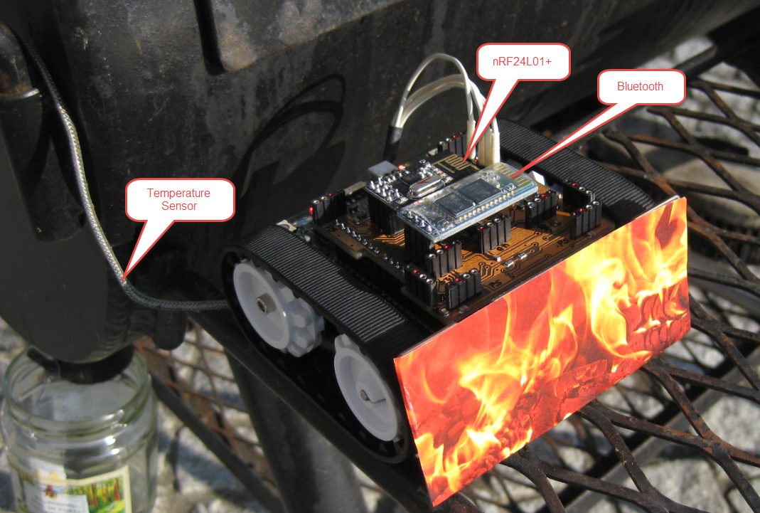 I already have a robot which allows me to communicate either with Bluetooth or nRF24L01+ (WiFi support is work in progress) with a wireless communication shield. So connecting the robot with the temperature sensor, and I have my BBQ smoker temperature monitoring robot: