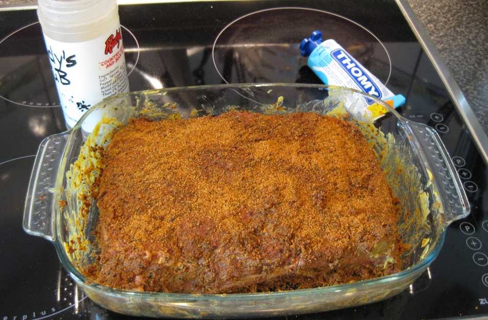 The rub gets gently massaged into the mustard and beef, so everything gets covered with it::