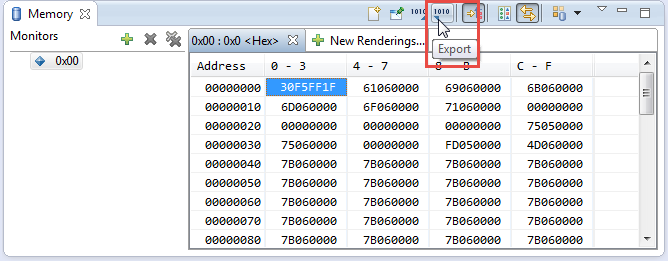 Now I use the Memory view to add a new memory monitor, starting at address 0x0: