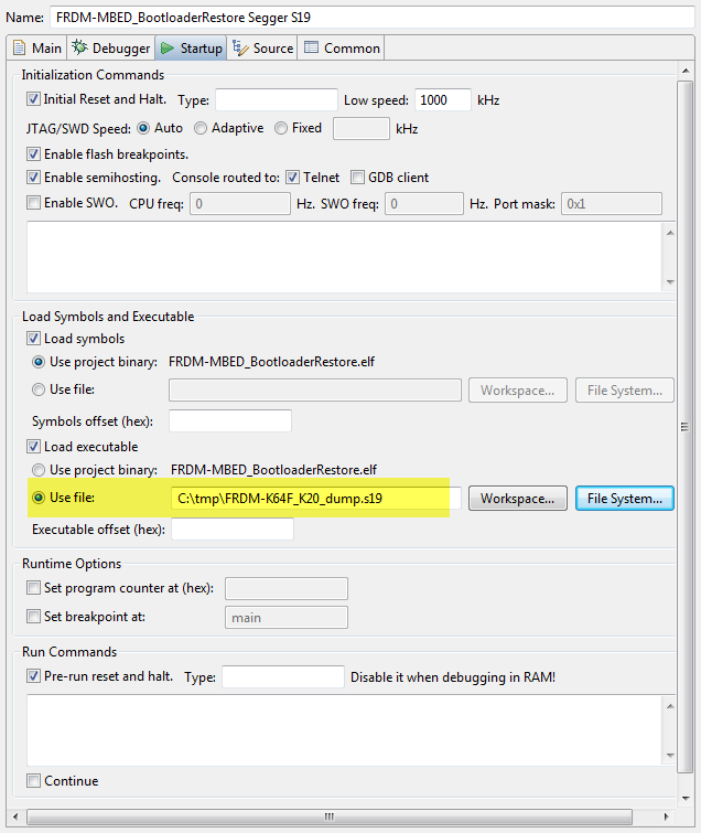 To program the firmware to the other board, I create again a launch configuration. This is a normal configuration, but instead the normal application file, I specify the S19 file I just have copied from the previous board: