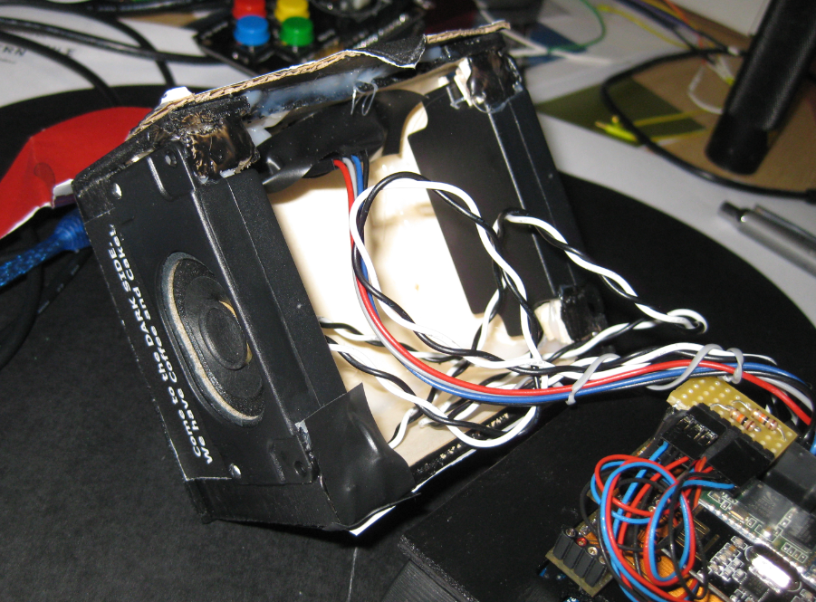 The HC-SR04 Ultrasonic sensor and the two Adafruit loudspeakers (Adafruit https://www.adafruit.com/products/1669) are glued into the upper housing: