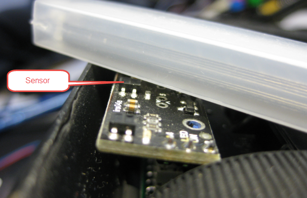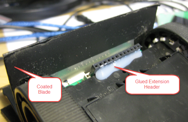 The headers are glued to the Pololu robot chassis (Pololu http://www.pololu.com/product/1418). Additionally, the blade inner side is coated with black tape to reduce any ambient light and to minimize reflections: