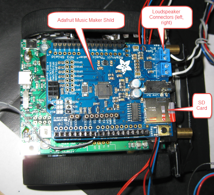 To play sound effects, the Adafruit Music maker shield is used. The pin assignment on the Arduino-compatible headers of the robot required to route some pins of the shield: