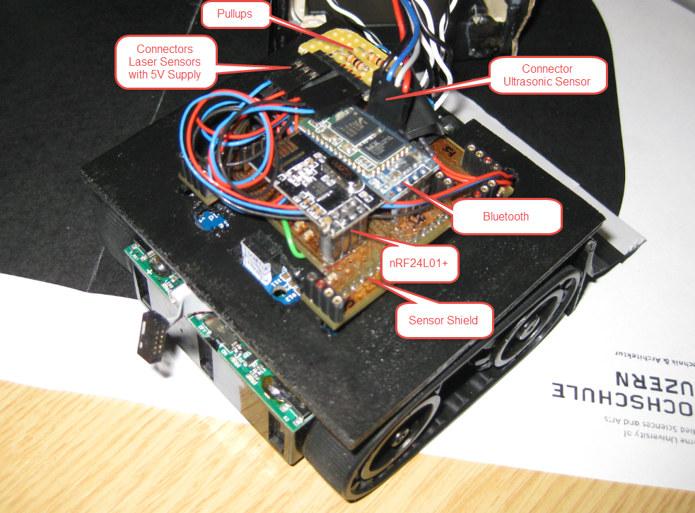 On top of the Music Shield there is the Sensor Shield (see “Sumo Robot Sensor Shield“). It provides connectors for the two laser sensors (including the needed two pull-up resistors), a connector for the ultrasonic sensor, the nRF24L01+ transceiver and a bluetooth module: