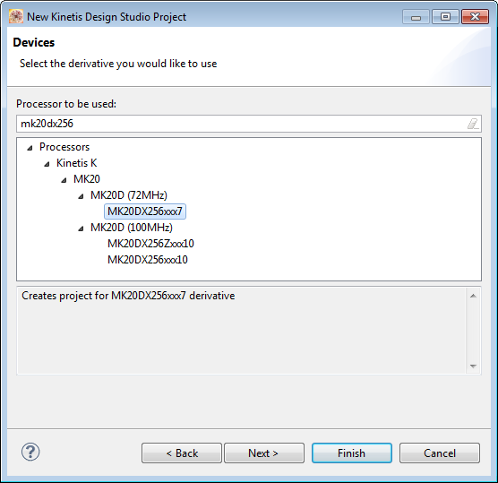 2. Create a new project (File > New > Kinetis Design Project) for the MK20DX256xxx7 72 MHz) microcontroller: