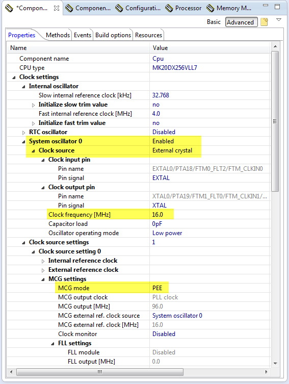 3. Configure the CPU clocks to use the 16 MHz external crystal and PEE mode: