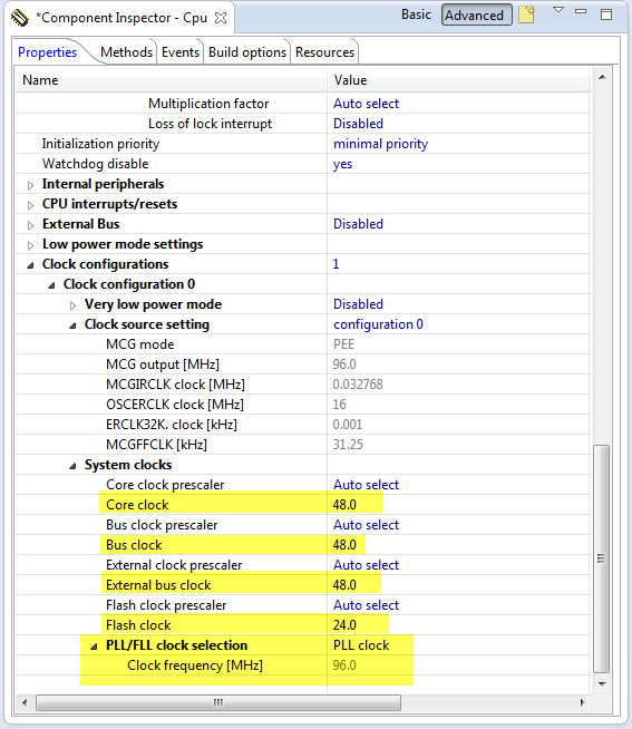 5. Configure the core clocks. Important part is to use the PLL clock selection and that it shows 96 MHz at the bottom: