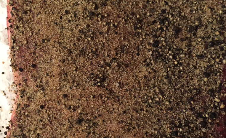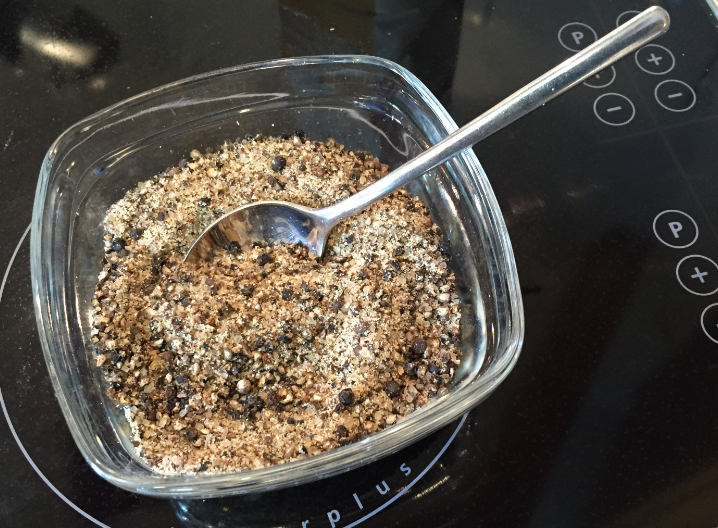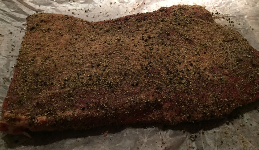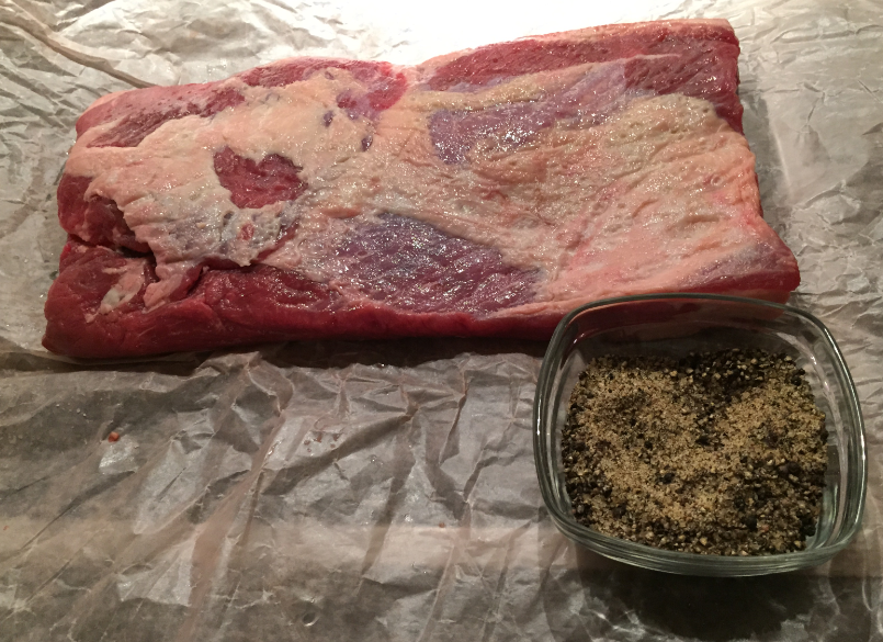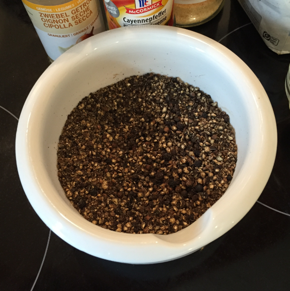 I have learned that Brisket is the national food of the Republic of Texas. I decided that this time I will do the rub differently: salting the meat the day before (see “Part 1: Barbecue Beef Brisket Texas Style – The Meat and the Salt“), and applying the rub (without any salt) just before putting the meat into the smoker. I’m using a variation of Texas “Dalmatian Rub”: salt (applied before), coarsely cracked black pepper with a few spices.