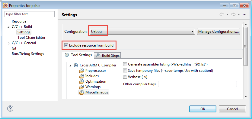As I do not need to compile pch.c for my normal build, I can exclude it from the build (context menu on pch.c, then choose Properties):