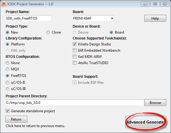 Here select the IDE/Toolchain (Kinetis Design Studio), the operating system (FreeRTOS) and select ‘standalone project’ with the directory where the project shall be generated. I recommend to use the Eclipse workspace location, but it could be anywhere else too.