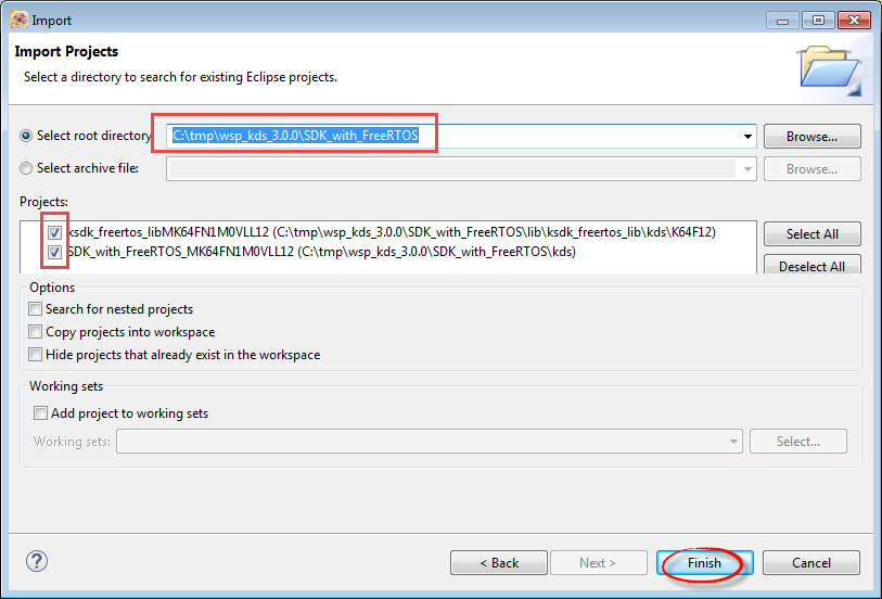 For this I use the menu File > Import > General > Existing Projects into Workspace in KDS/Eclipse and specify the location where the project has been generated by the generator in the previous step.