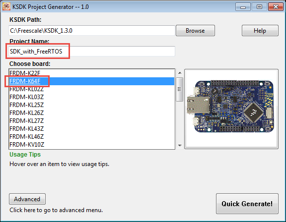 Launch the Project Generator executable (On Windows: <GeneratorPath>\Windows\KSDK_Project_Generator.exe).