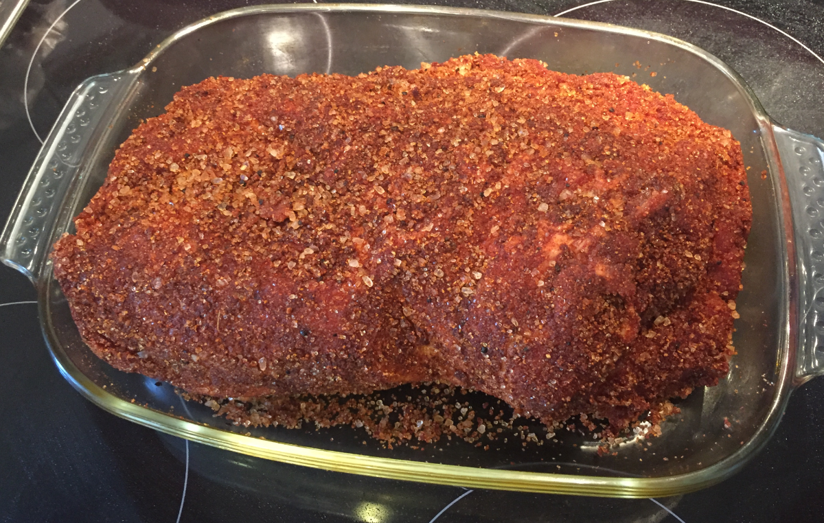 Putting it out of the fridge at 5am: the rub nicely covers the meat: