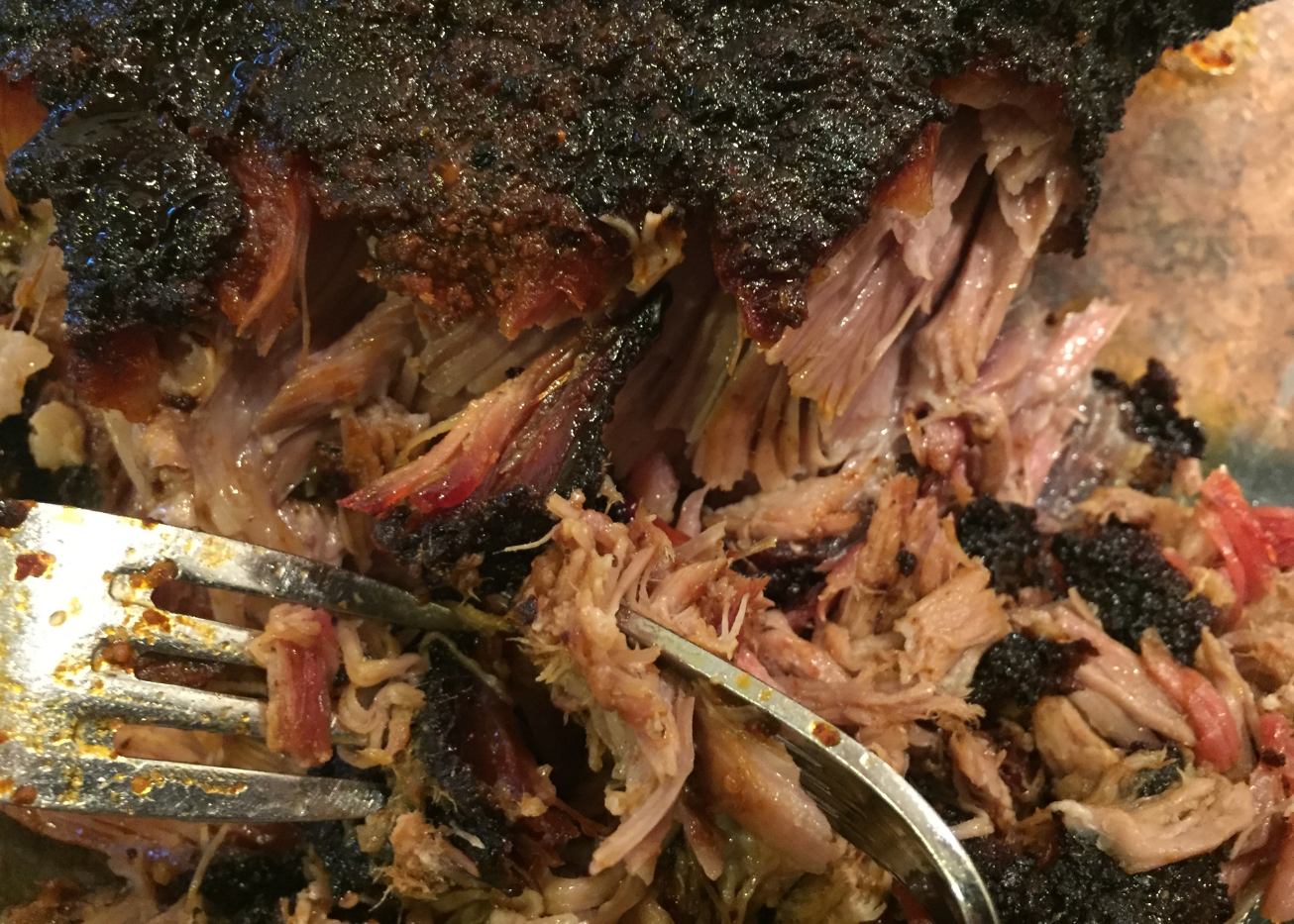 With two forks the meat gets pulled. It is so soft that no force is needed! It has a nice crunchy bark and is soft and tender inside :-):