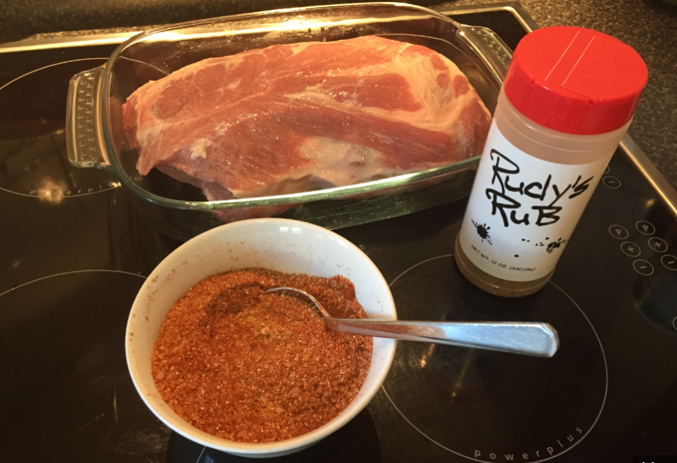 Apply the dry rub. I massage it into the skin real good, plus under any flaps I may come across. Getting a good rub is important, because the rub will be distributed for the pulled meat.