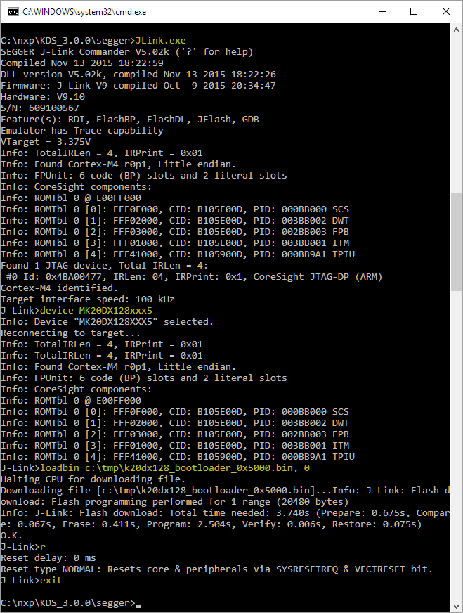 (use SWD and 4000 kHz) - Load the binary: loadbin k20dx128_bootloader_0x5000.bin, 0