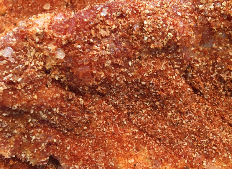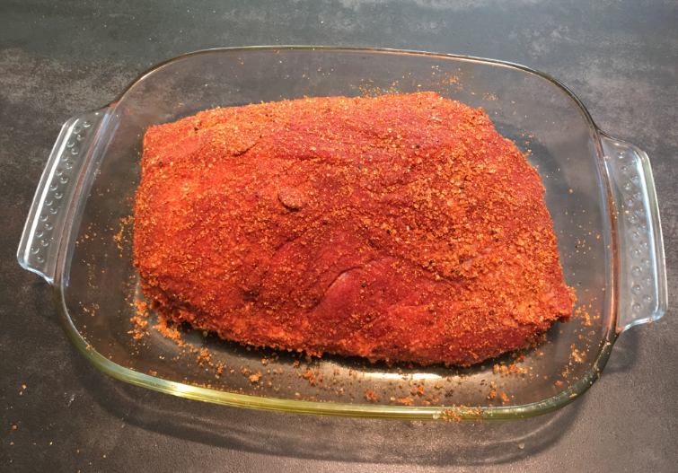 For the pork (2.2 kg) shoulder I use vegetable oil (sunflower oil) to make the dry rub stick better: massage the oil into the meat, then apply the rub.