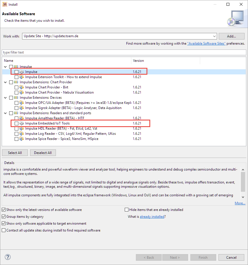 Do you guys have the ‘impulse’ tab in the Debug configuration as shown in the videos on this page: http://toem.de/index.php/projects/impulse/articles/98-using-seggers-system-viewer-with-impulse.