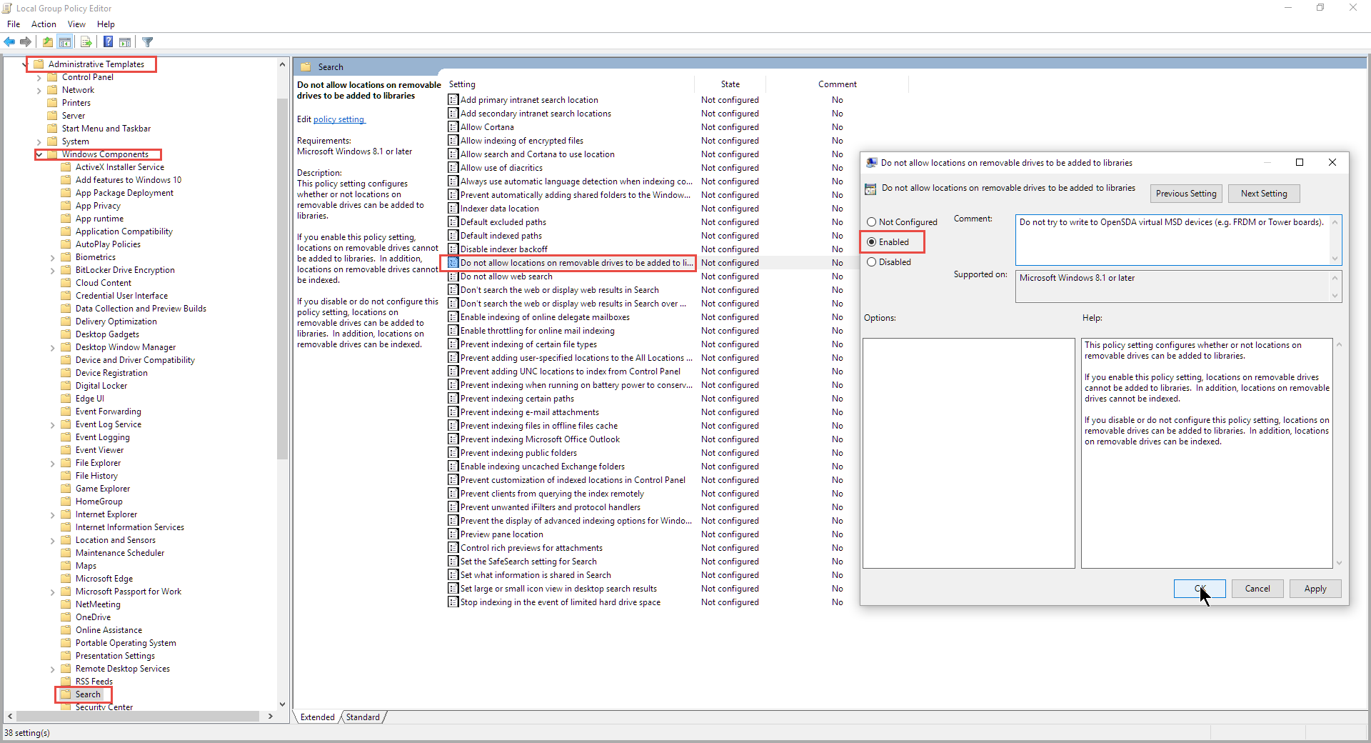 Computer Configuration \ Administrative Templates \ Windows Components \ Search \ Do not allow locations on removable drives to be added to libraries