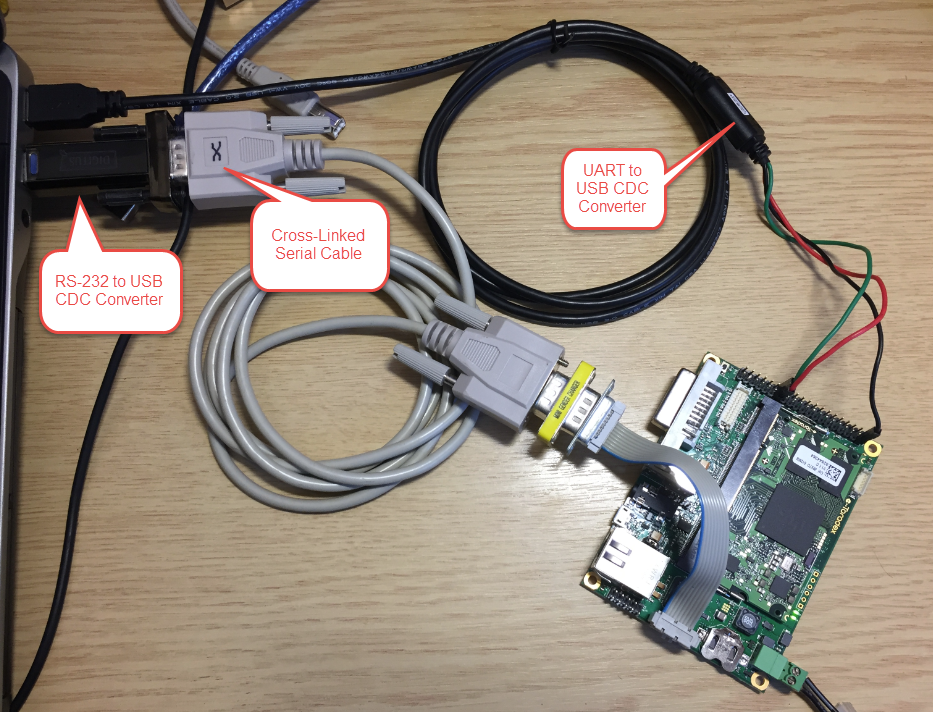 2. Serial connection to the host: either a real RS-232 port with a cross-link cable) or a UART-2-USB converter