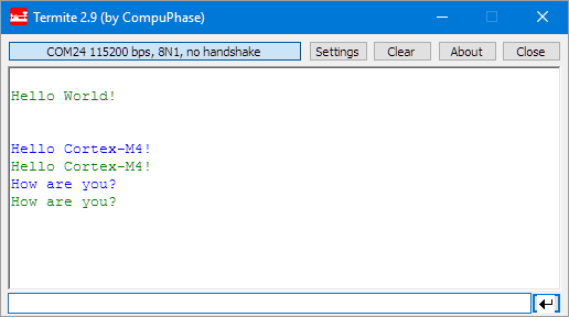 With the terminal connected to UART-B, I should see the ‘hello’ message. And the FreeRTOS task will echo whatever I submit on that UART from the terminal: