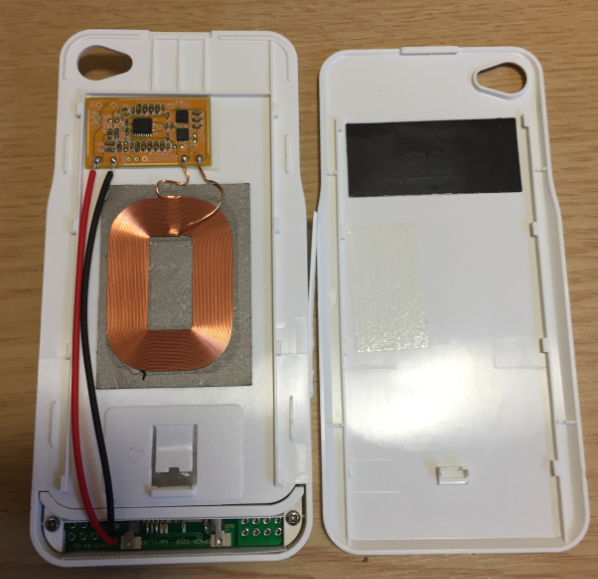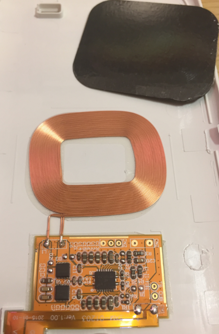 The question is: can I use these for my projects? So I decided to open up the wireless phone cover. The cover has to plastic parts, and with a bit tweaking I was able to separate them. Insider there is the battery connector, the receiver circuit and the charging coil under a black FFDM (Flux Field Directional Material):