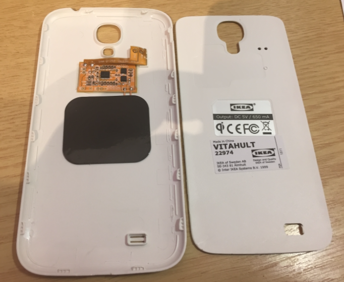 I have been experimenting with wireless charing for a few weeks, including building a Qi charging station using a kit from Adafruit (see “Qi Wireless Charging Transmitter with 3D Printed Enclosure“). The problem is that getting Qi charging receivers seems not to be that simple. With my research I have found that the Apple iWatch is using Qi technology, but they tweaked it in a way that it only works with the Apple chargers/receivers (see “Apple tweaked the Qi charging standard so that Apple Watch only works with its own chargers“). Interestingly, the furniture company IKEA is selling Qi transmitters and receivers (http://www.ikea.com/us/en/catalog/categories/departments/wireless_charging/). To my surprise, when I visited a nearby IKEA store yesterday, the older iPhone and Samsung Galaxy S4 (VITAHULT) Qi receivers were on sale for CHF 0.95 (about US$1): what could be wrong with buying a few of them? At this point, I should probably mention the ‘rolling eyes’ of my wife ;-).