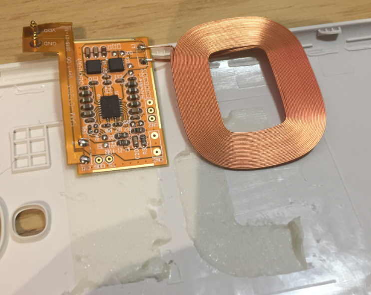 The coil is a larger one, and the receiver electronics are shielded with a piece of FFDM (?). As the coil is too large for the Hexiwear, I’m continuinig with the Samsung S4 receiver and coil.