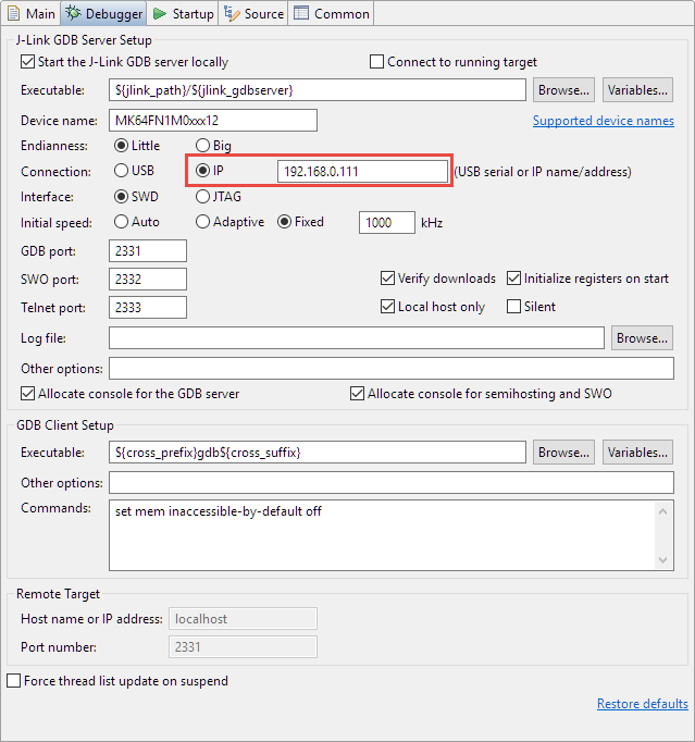 Now all what I need to do from another machine to debug that board is to specify that IP address in the Eclipse Debugger launch dialog: