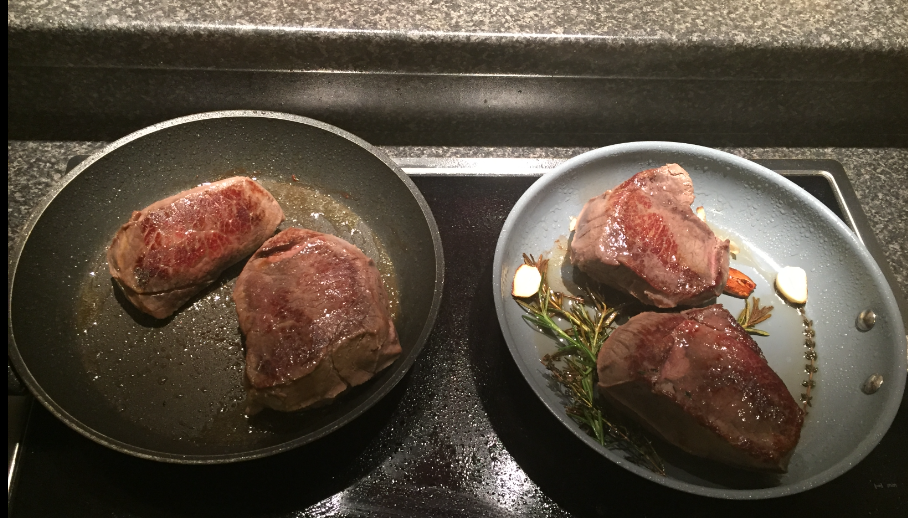 The sealing keeps the meat moist. And the slow cooking ensures reaching an exact meat core temperature. After three hours (duration depends on meat and thickness), ready to take it out. The downside of the sous-vide cooking is: it does not look pretty, and the meat is only warm. The solution is browning the steaks for less than a minute: