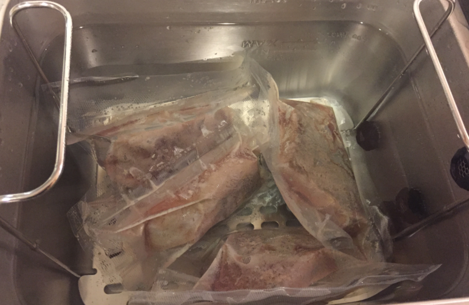 “Sous-Vide” (French for ‘under vacuum’) is a special cooking method. The food is sealed in a plastic pouch and then placed in a temperature controlled water bath. It takes a longer cooking time, but the result is amazing.