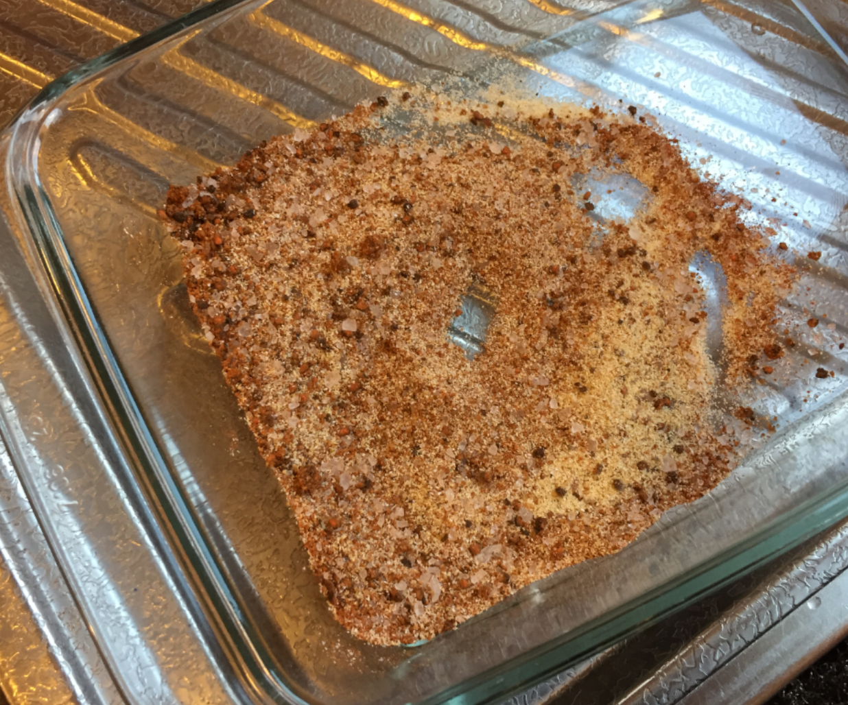The rub in a bowl: onion powder, brown sugar, black pepper, garlic powder, paprika powder, salt: