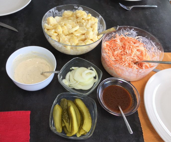 Side dishes: Onions, pickles, mixed carrots and celery salad, potato salad, Alabama style BBQ sauce and the reduced sous-vide juice sauce.