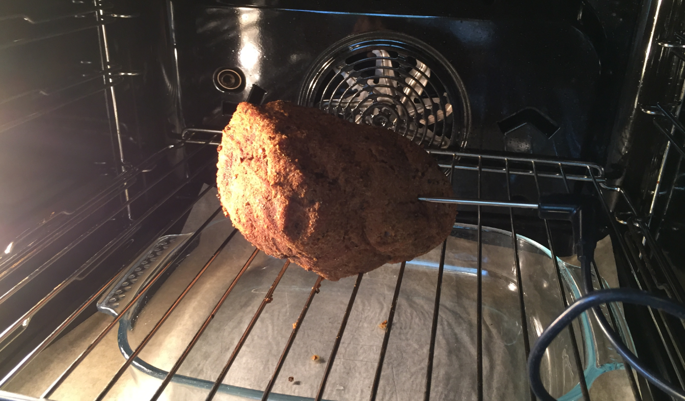 Keep it in the oven until its core temperature reaches 92°C. For that 1 kg piece it takes 1.5-2 hours, then take it out: