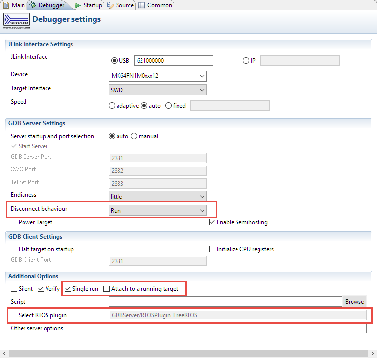 The IDE setup comes with a new Segger J-Link software, plus new settings to configure the disconnect behaviour, a check box to connect to a running target plus a GUI choice to enable and select the RTOS thread awareness: