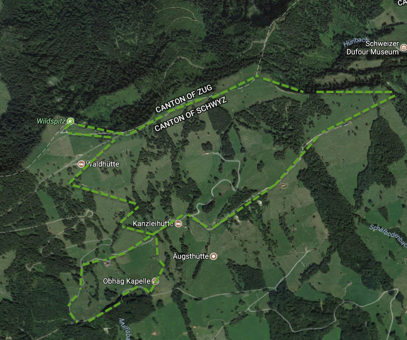 The route is shown below, with the start at “Obhäg Kapelle”, then up to the “Waldhütte” and “Wildspitz”, following the border towards “Dufour Museum” and then going down to the “Kanzleihütte” and around the “Blindsee” back to the “Obhhäg Kapelle”: