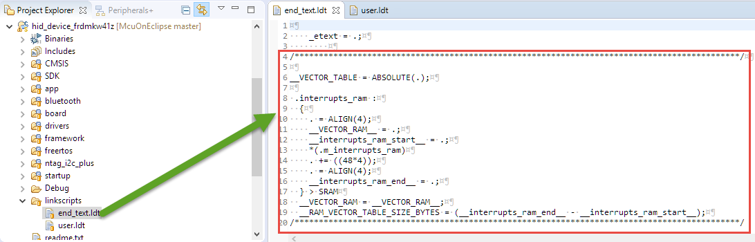 To add this to the MCUXpresso IDE linker file, I’m extending the end_text.ldt with that snippet: