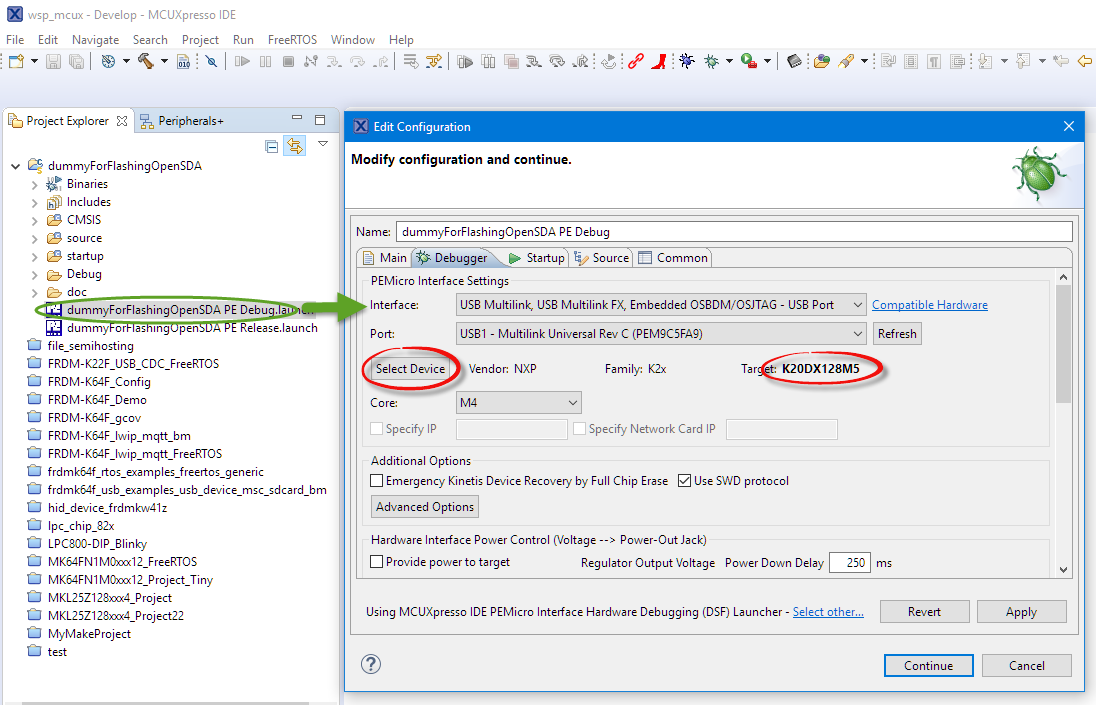 Double-click on the created debug launch configuration to open it. Use the ‘Select Device’ button in the Debug tab of the P&E Debug connection to set the device to the K20DX128M5 which is used on the board for the OpenSDA circuit: