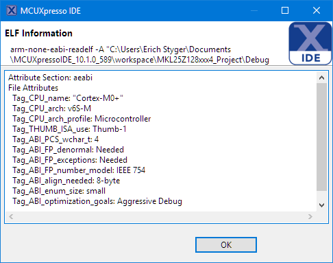 ELF Information Published November 25, 2017 at 486 × 383 in Eclipse MCUXpresso IDE 10.1 with integrated MCUXpresso Configuration Tools ELF Information ELF Information