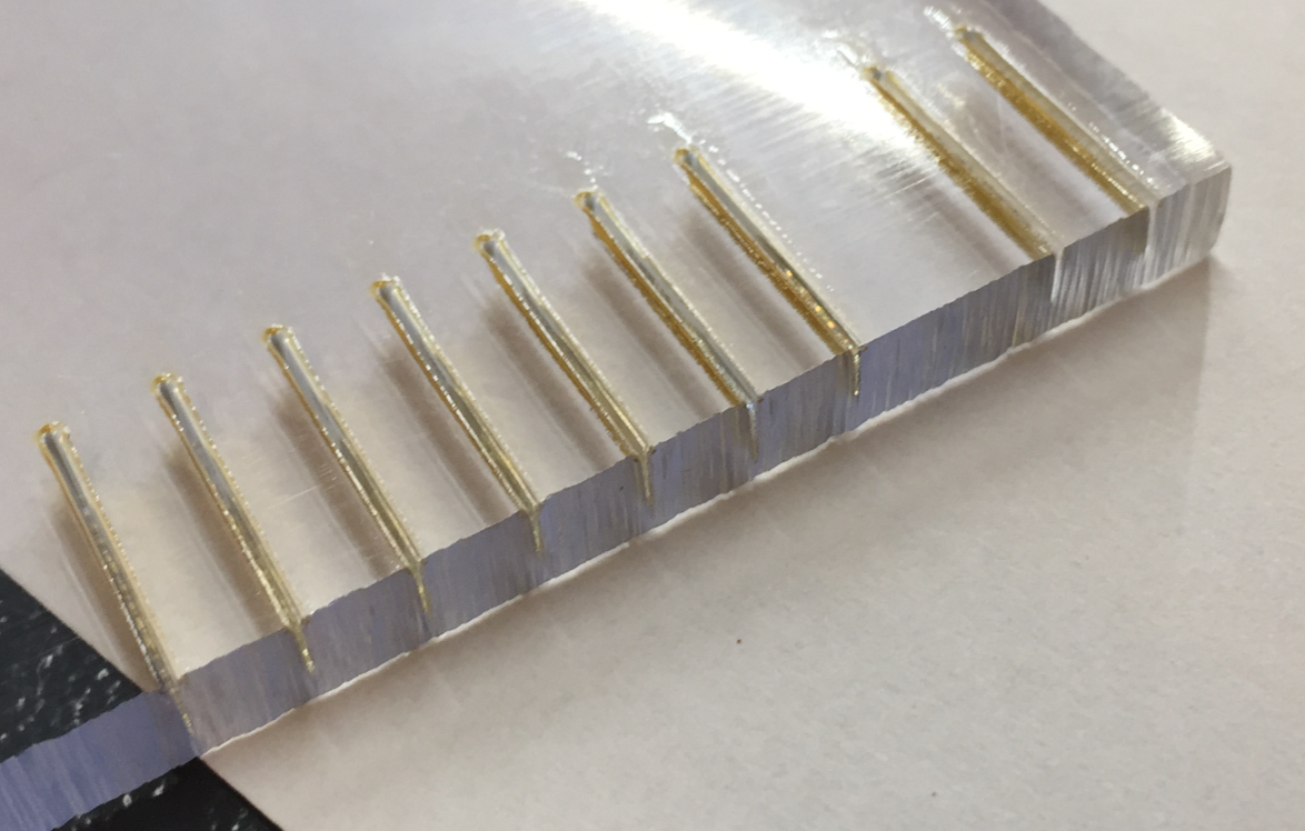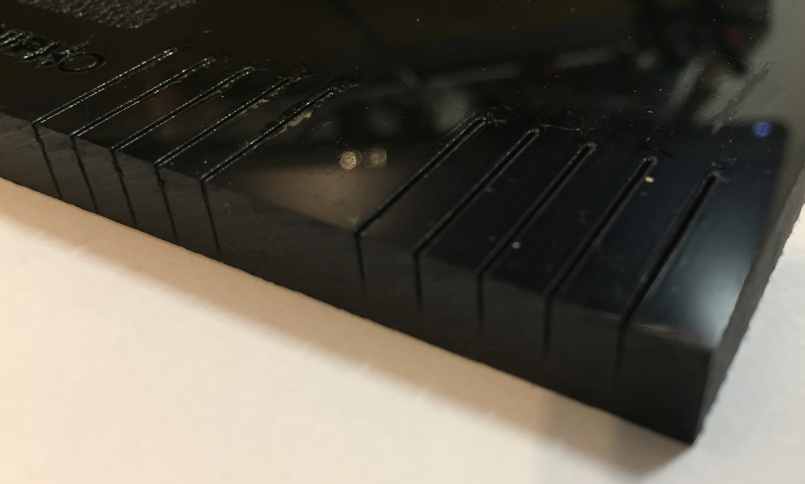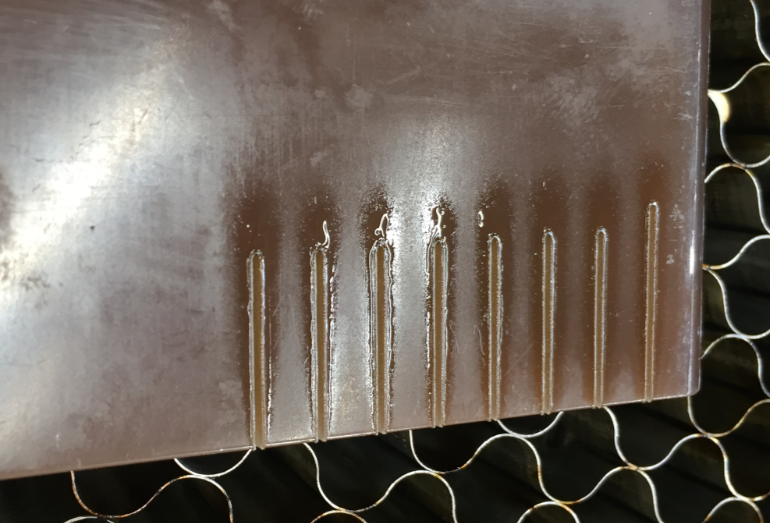 Next I used the clear sheet. Below are test cuts on that 6mm sheet, from right to left with 20%, 25%, 30%, 35%, 40%, 45%, 50%, 55% and 60% laser power. This time, it did not cut through with 60% what it usually does with PMMA. Here again it is a bit harder to cut it. compared to PMMA. And again the process created some residue on the surface: