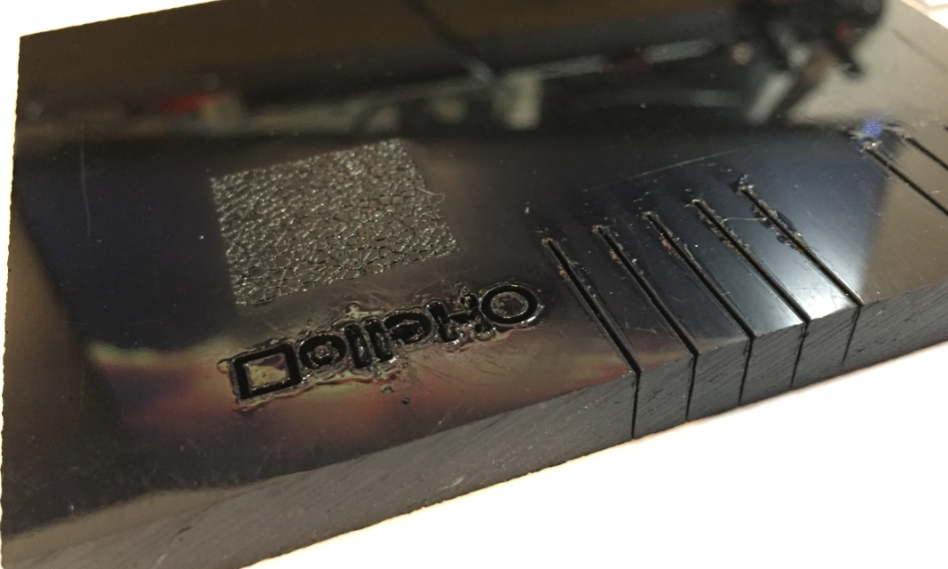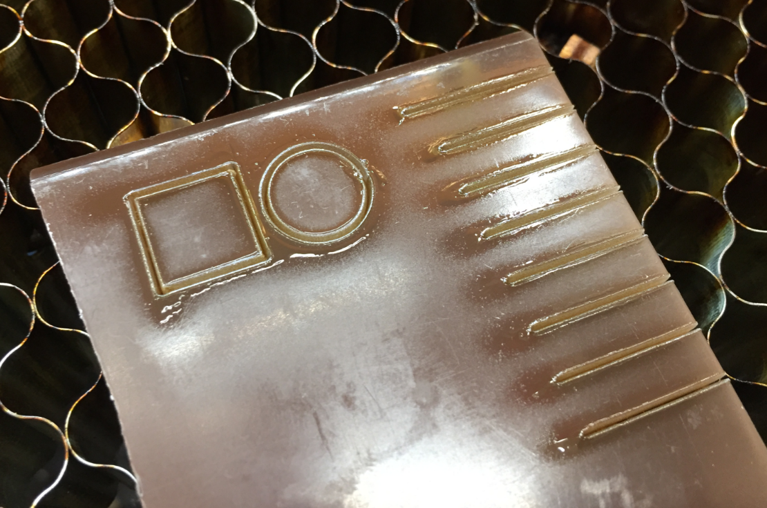 On plywood and PMMA I usually use a laser speed of 150 mm/sec at 2-3% laser power, so I used the same setting.Β To my surprise, it clearly engraved it without any residue. Below a sample on the 4 mm brown sheet: