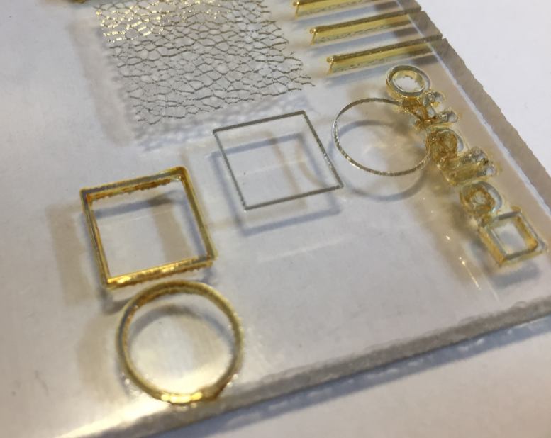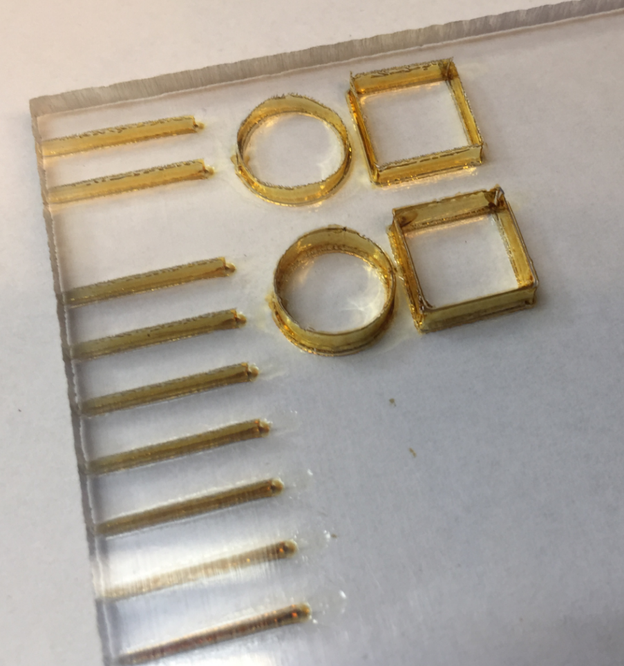 So what I tried is reducing the laser power for the cuts to 3% and using a higher speed (20 mm/sec). And indeed, as you can see with the circle and quadrat in the middle, this works very well. But when I repeated the sameΒ several time (lower left corner) to cut deeper, it started to add that residue again.
