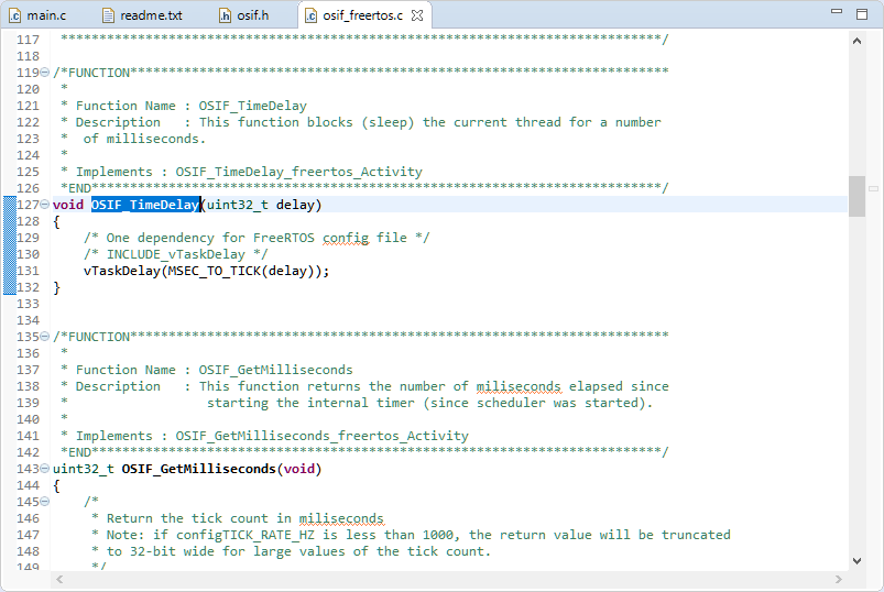 The challenge I had was to make the OSIF component aware that there is a custom FreeRTOS component in the project (it worked fine with the NXP supplied one). If the presence of FreeRTOS is detected, the OSIF will use the RTOS services. Otherwise it will create its own services, e.g. using the SysTick timer interrupt.