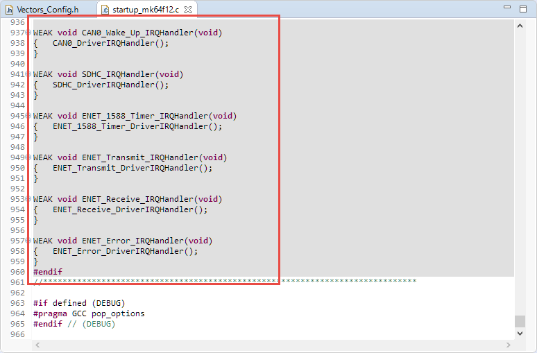 This step is probably the most complicated, because here I’m going to use the MCUXpresso SDK startup code with the vector table created by Processor Expert. That way I get the feature having MCUXpresso IDE to manage the linker files. The challenge is that different names are used by the SDK and Processor Expert for the reset routine and the initial stack pointer.