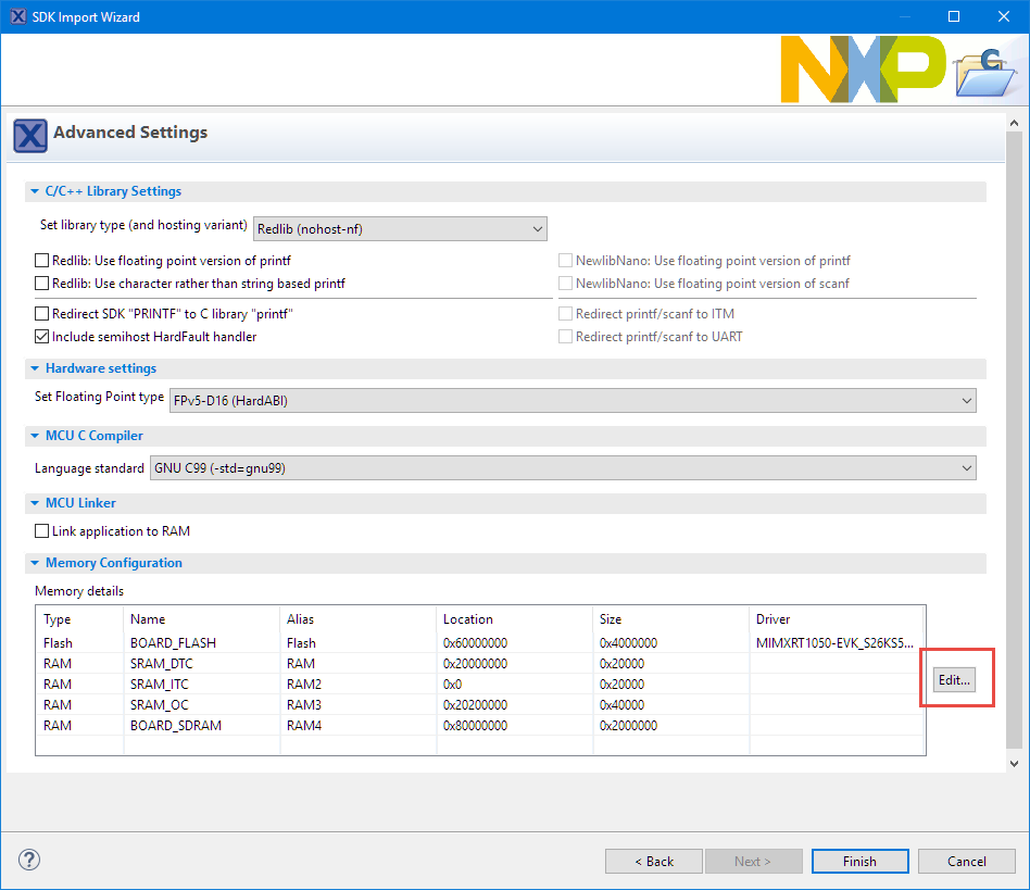 Because Embedded Artists board has a different external FLASH device, press ‘Edit…’ in the next dialog: