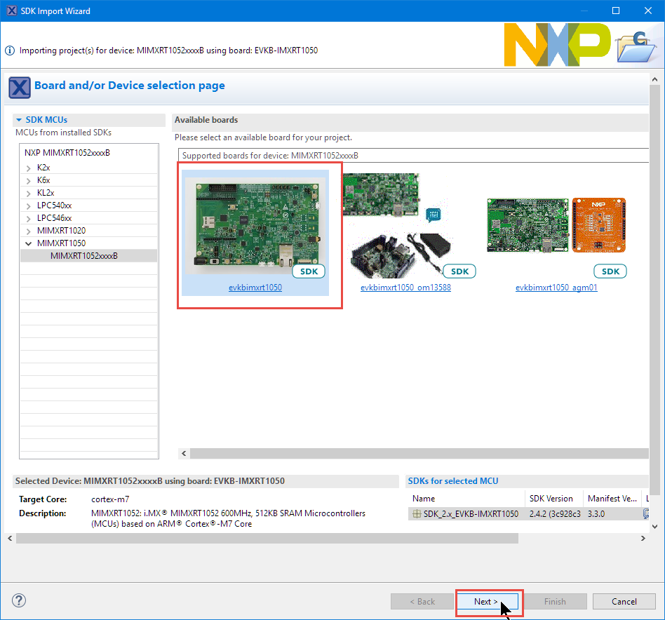 Because the SDK does not have the Embedded Artists board listed, select the i.MX RT1050 EVKB board: