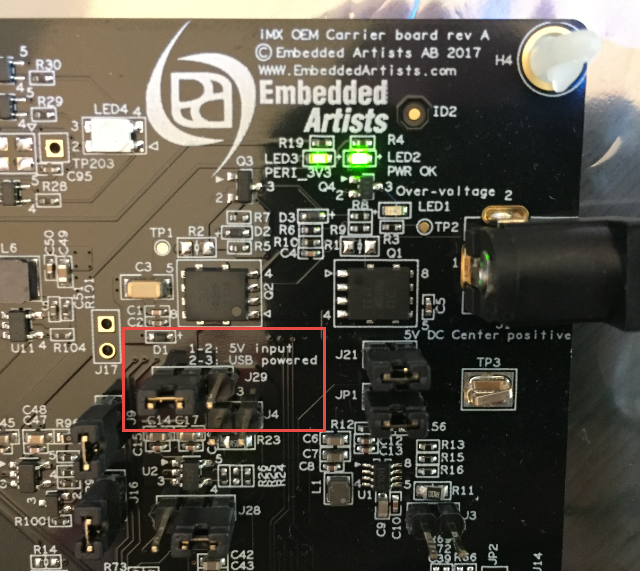 I prefer to power the board with an external 5V power supply. For this jumper J29 has to be set on position 1-2: