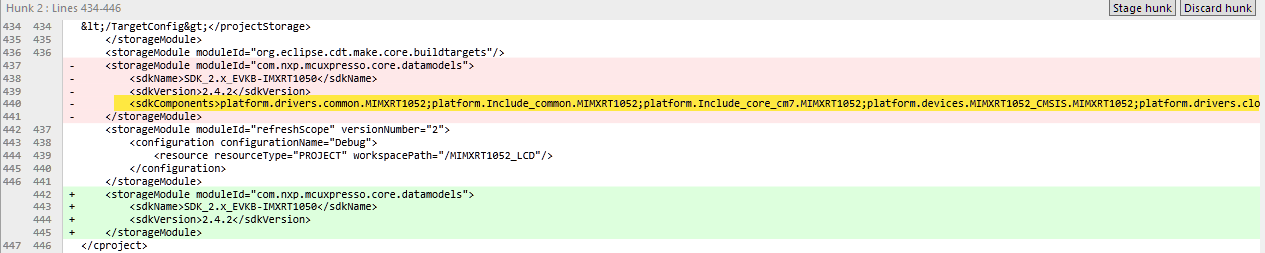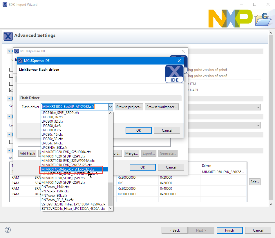 At least with MCUXpresso IDE 10.2.1 the second step cannot be done directly in the IDE, as changing the flash type seems to affect other SDK settings.What I have observed with using the GUI on the project it removes some SDK component settings in the .cproject file: