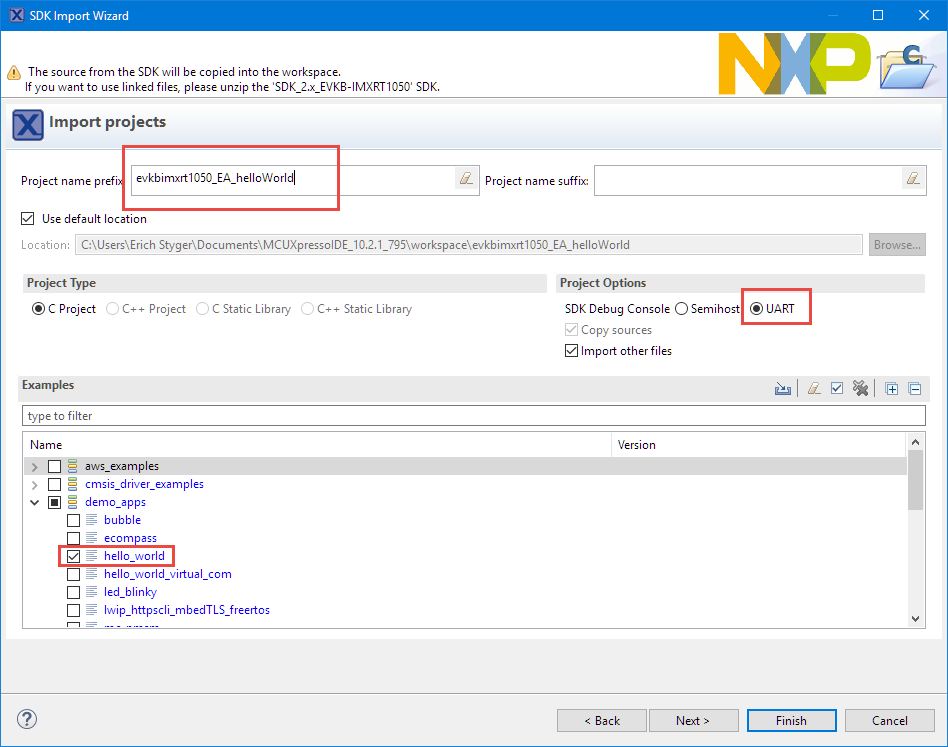 In the wizard, give the project a name and select the ‘hello world’ with UART selected: