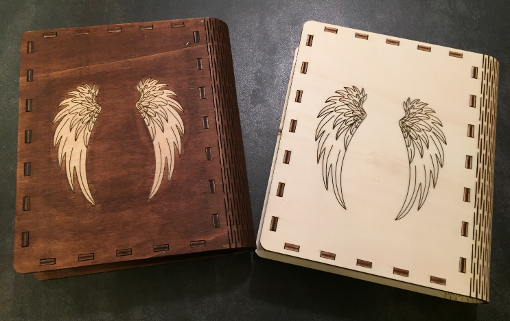 I created two versions of the design in Inkscape: one painted and one engraved only. The boxes have a side latch.